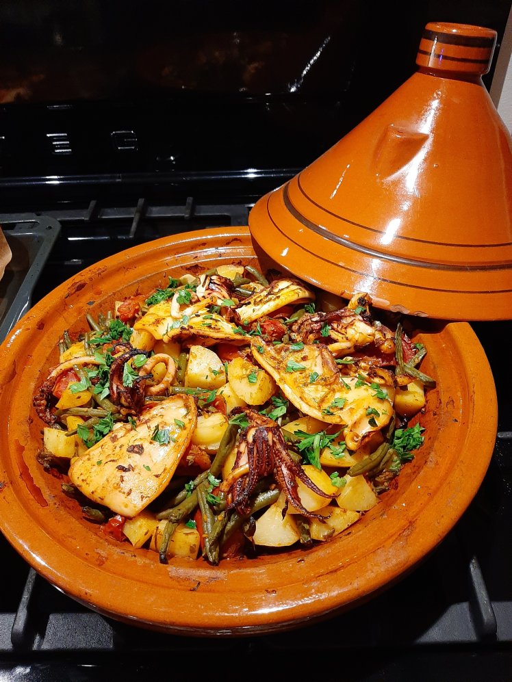 Remove the skin of 600 grams of potatoes. Chop the potatoes in cubes. Put in a tajine. Add 750 grams of tomatoes, chopped in cubes. Mix with 500 grams of green beans. Mix with the chermoula, pepper, salt, an extra drizzle of olive oil and some lemon juice. Cover the tajine. Bake in the oven at 200° for 1h. The dish is ready if the potatoes are soft. Stir halfway, add some water if necessary. Put the calamari on baking paper on oven tray. Grill in the oven. Put the calamari on the vegetables. Finish with fresh parsley. Enjoy.