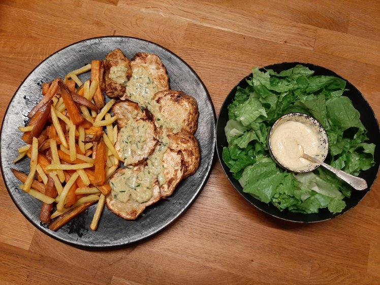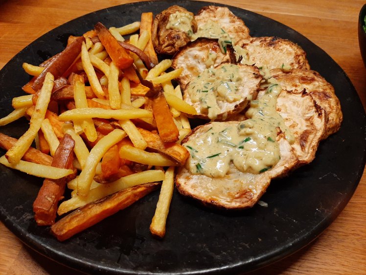 Celeriac is one of those fabulous ingredients which we often know in cold salad or in combination with a traditional bechamel sauce. It’s super cheap and healthy. The earthy-nutty-sweet flavor is at its best when roasted. Ottolenghi describes 3 different ways to use roasted celeriac. He starts by roasting a whole celery for 2,5h, which I find a lot if you cook for 2p. So, I simplify the celeriac steaks with Café de Paris sauce in my version.