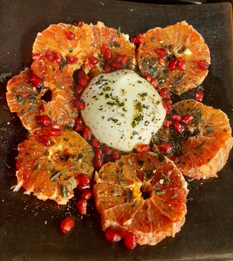 For 2p, remove skin from 2 tarocco oranges ( you could use the zeste for the dressing). Slice and spread on 2 plates. Halve 1 buffalo mozzarella. Put each half in the middle of the plate. Season with pepper, salt, fresh basil and good olive oil. Finish with seeds of a pomegranate.