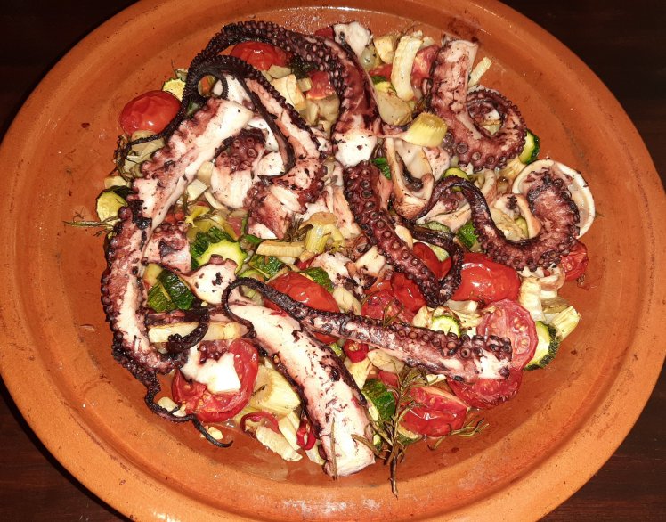 Chop 1 fennel, 3 courgettes, 4 garlic cloves, 1 red onion, 400 grams of cherry tomatoes and spread on a large oven dish with a few stems of fresh rosemary and some olive oil. Bake in the oven at 200° for 30mins. Stir halfway. Spread the octopus parts after 30 mins. Bake for another 20 minutes. Season with salt and pepper.