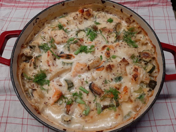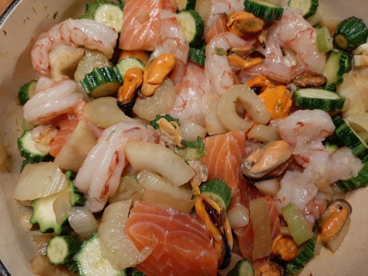 This dinner is for 2-4p ( depends on appetite, possible other courses). Heat a pan. Add 1 kilo of cleaned shells, in my case mussels and vongole. Close the pan. Once the shells are opening, stop the fire. Drain and keep the cooking liquid. Chop 1 large fennel, 500 grams of baby courgettes ( the last ones from our garden) and, of course, 4 garlic cloves. Heat the same pan, add a drizzle of olive oil. Add the fennel and bake for approximately 10 mins. Add the courgettes and garlic later and bake for 5 more minutes. Stop the fire. Heat 1 large table spoon of butter. Add 1 large table spoon of flour. Stir constantly. Once you get the typical cookie smell, add the cooking liquid (approximately 400 ml). Stir constantly until the sauce start boiling and thickening. Add 100 ml of cream to soften texture and flavor. Stop the fire. Add 1 table spoon of grain mustard and 1 table spoon of dijon mustard ( to make it a little bit spicier). Finish with 30 grams of grated parmesan(originally Janneke Philippi suggested gruyere which has a more particular flavor). Taste, add pepper and salt if needed.