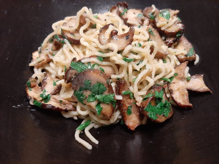 Clean and slice 600 grams of fresh porcini. Spread on baking paper on an oven tray. Season with pepper, salt, some fresh thyme, 4 chopped garlic cloves and a drizzle of good olive oil. Mix everything together. Bake in the oven at 200° for 20-30 mins. Stir halfway. Boil the pasta al dente in salted water. Mix pasta and porcini. Add some of the cooking water. Serve with fresh parsley and an extra drizzle of olive oil.