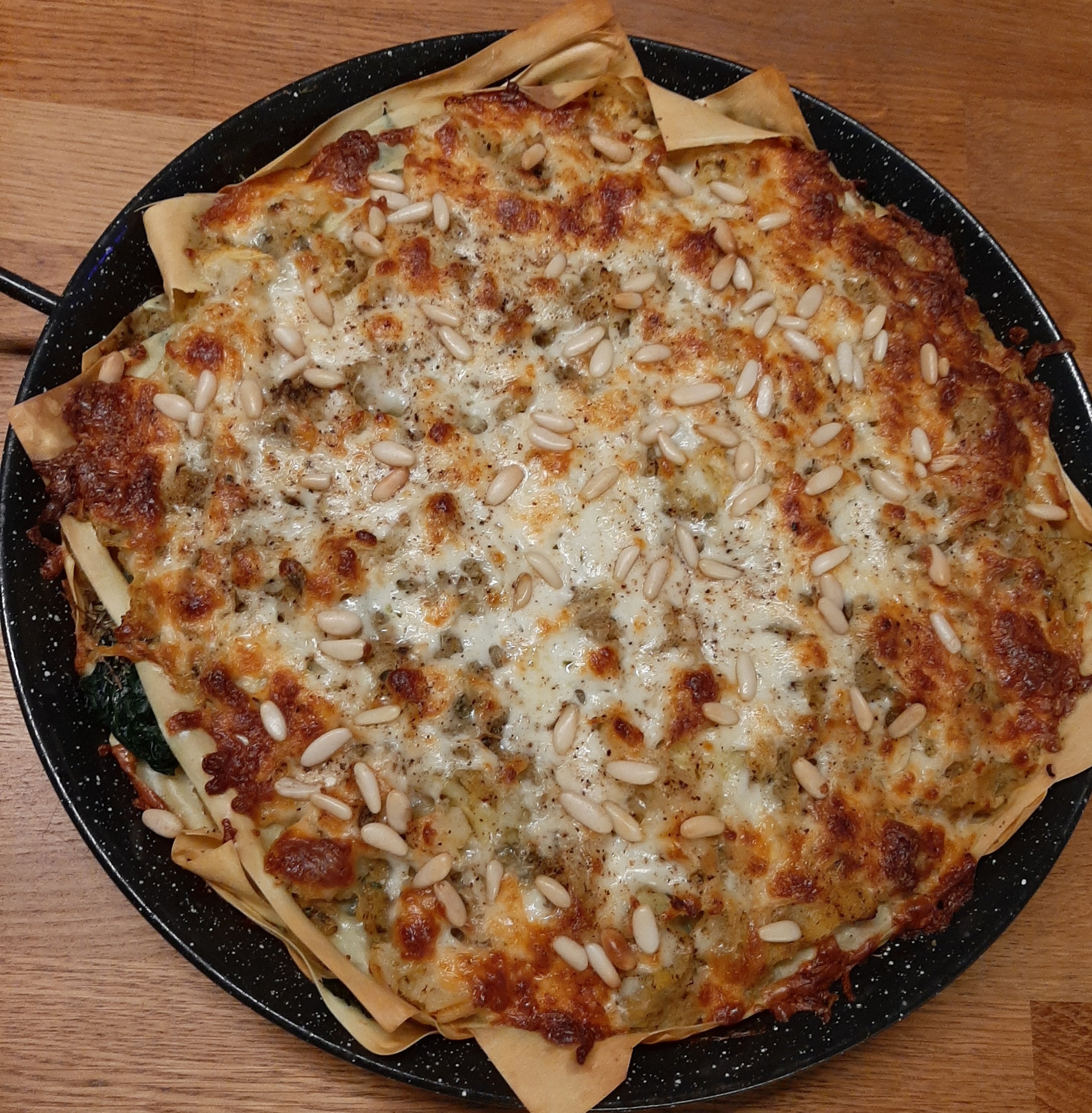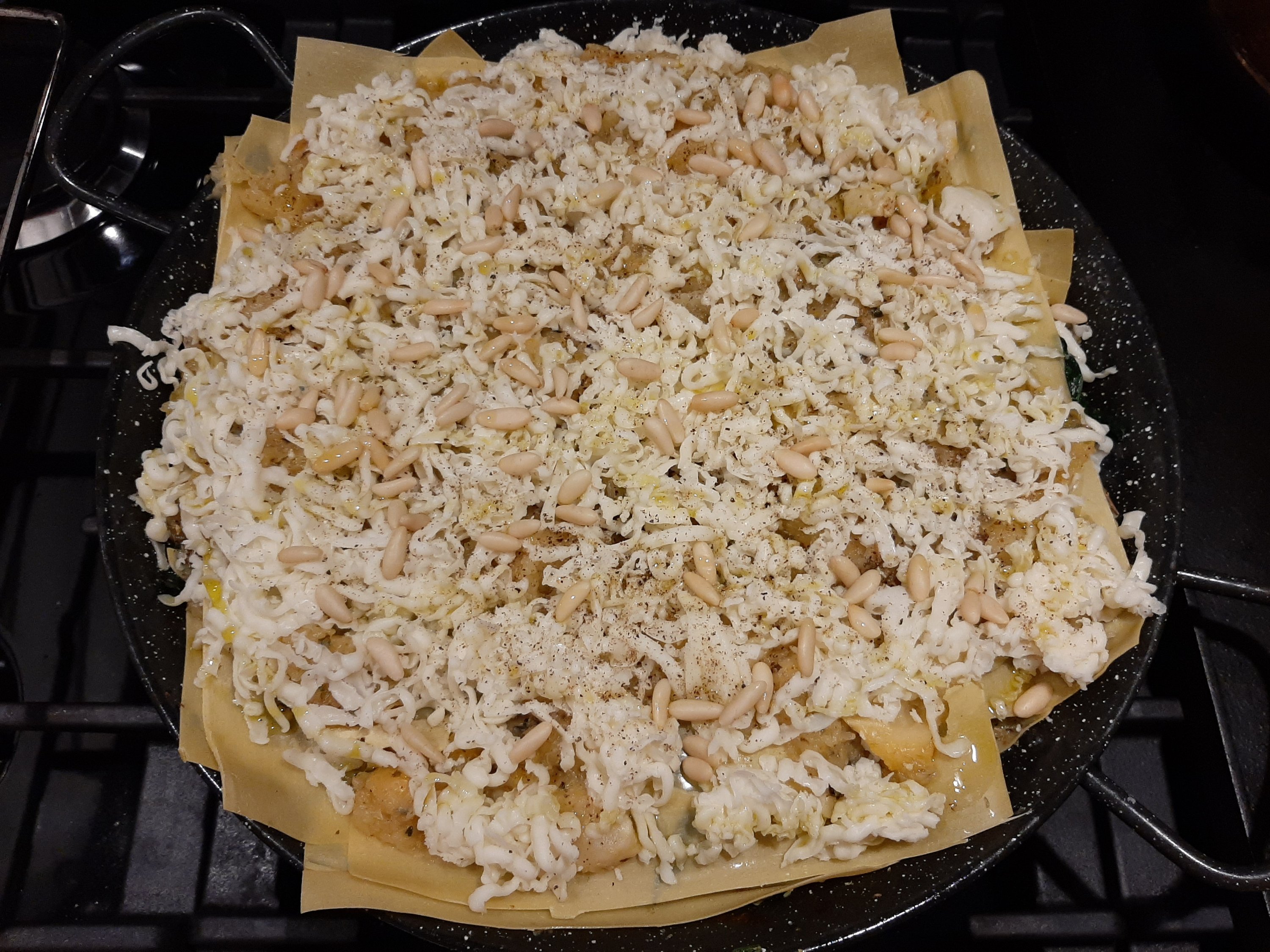 Use the same oven dish. Spread a thin layer of the pumpkin. Cover with thin lasagna sheets. Spread another layer of pumpkin and some spinach. Season with extra oregano, pepper and salt. Continue. Finish with lasagna sheets, pumpkin and 150 grams of grated bel paese ( one of my favorite italian cheeses based on cow’s milk). Spread 30 grams of pine nuts. Finish with a little drizzle of olive.