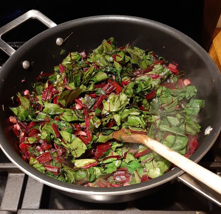 Rinse the leafs, drain and chop. Heat a pan. Spread a drizzle of olive oil. Add 4 chopped garlic cloves and the chopped leaves. Bake and stir. Add 1 table spoon of dried basil, pepper and salt.