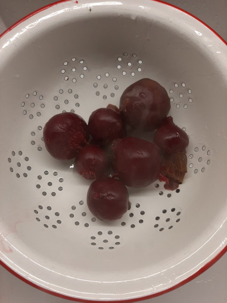 Once the beetroot are al dente, drain and rinse with cold water. If you’re lucky the skin comes off by itself. Slice the beetroot.