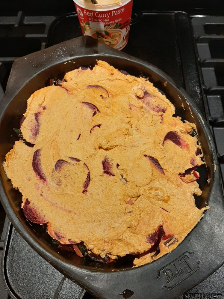 Mix 250 grams of ricotta with 1 table spoon of red curry paste. Spread on the beetroot. Finish with grated parmesan and a drizzle of olive oil. Bake in the oven at 180° for approximately 30 mins.