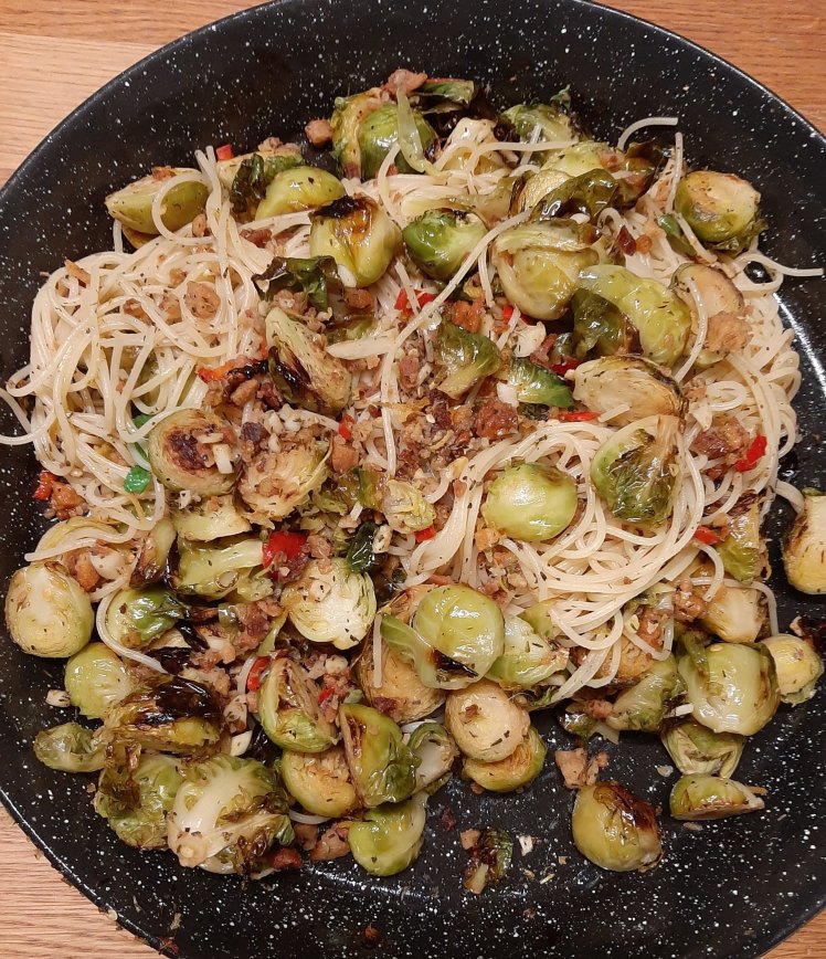 For 2p, clean 750 grams. Cut in halves. Spread on an oven dish. Add a drizzle of olive oil and 2 teaspoons of savory. Stir. Bake in the oven at 180° for 30 mins. Halfway, stir. Mix 4 chopped garlic cloves, 1 chopped chili, 70 grams of old breadcrumb and 4 anchovies filet. Continue the baking.