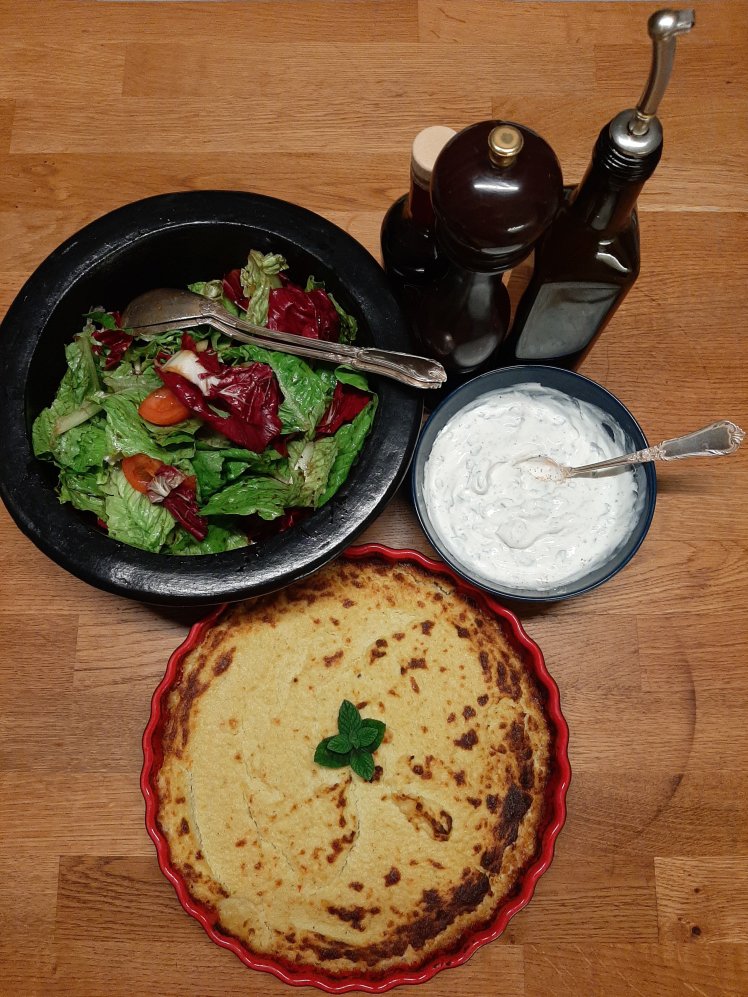 Steam 1 small chopped cauliflower for a few minutes. Drain. Mix in a blender. Add chopped, fresh mint ( depends on your taste), 200 grams of feta (I tried out a vegan one which contains more liquid), 2 eggs, 2 table spoons of almond flour, 4 chopped garlic cloves, pepper and salt. Mix. Pour the mixture in a springform covered with baking paper. Store in the fridge. Bake at 180° for approximately 40 mins.