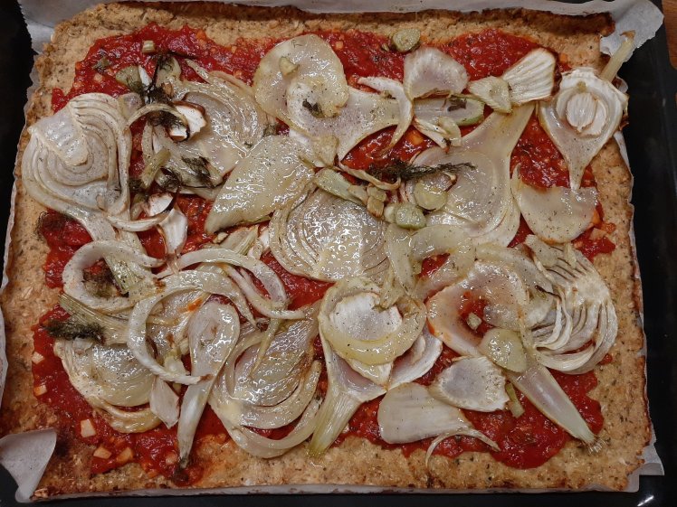 Today, we’re having a cauliflower pizza. Chop the cauliflower. Blend. Add 100 grams of almond flour, 100 grams of oat flakes, 1 table spoon of dried oregano, 2 eggs, pepper and salt. Mix. Spread the mixture on a greased baking paper on an oven tray. Try to obtain a thickness of 5mm. Bake in a preheated oven at 200° for 20 mins. Spread 1 sliced fennel on baking paper. Spread some oil. Roast in the same oven for 15 mins.