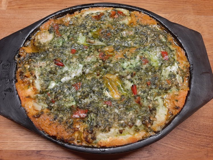 Mix 400 grams of sliced fish filet ( we have some cod) with some of the pesto. Press them on the puree. Finish with the pesto.