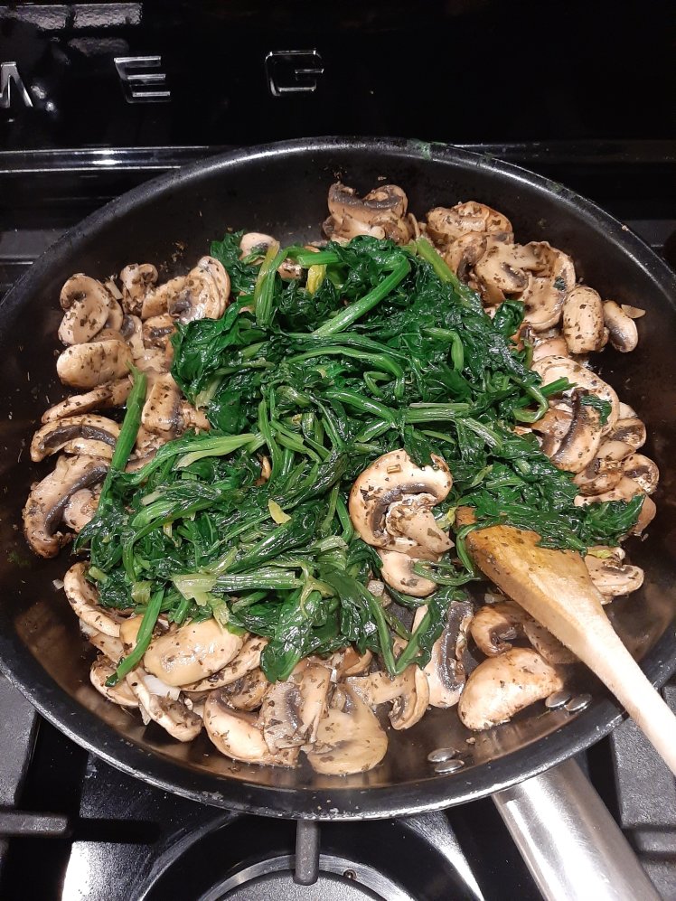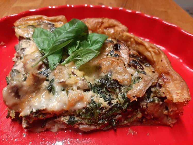 20 years ago quiches became really popular. Different varieties of pies in combination with a large salad for a large group of eaters were easy to prepare in advance and are still an excellent way to please everyone.The only disadvantage remains that you can easily eat a lot of kcal without feeling overloaded, but I admit that quiches are awesome comfort food.The 10th anniversary edition of Libelle lekker’magazine offers 70 cosy recipes. One of them inspired me for this quiche. Prebaking a quiche is incredibly important to obtain also a well baked bottom. Put the puff pastry in cake form. Make some holes in the dough by using a fork. Cover with baking paper. Fill with dried beans or dried peas or baking pearls. Bake during 10 minutes at 180°. Stop the oven. Remove the beans/peas/pearls and put back in the oven to continue ‘after baking’. Clean and wash 500 grams of fresh spinach. Drain. Heat a pan. Spread a little drizzle of olive oil and bake the spinach until al dente. Drain.Chop and fry 4 garlic cloves. Add 500 grams of sliced mushrooms and 2 teaspoons of dried basil. Bake. Add to the spinach. Taste, add pepper, salt and some nutmeg.
