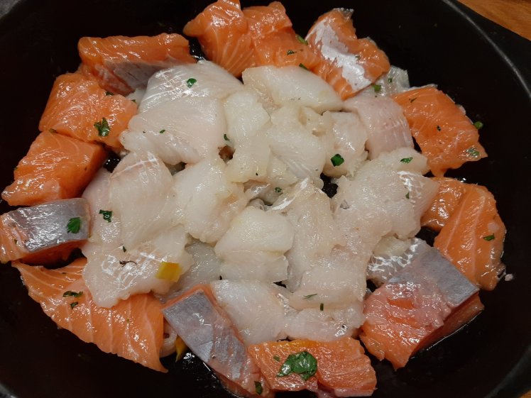 Chop 500 grams of mixed fish in cubes ( whatever you prefer, we will have some salmon and some cod). Spread in a greased oven dish.