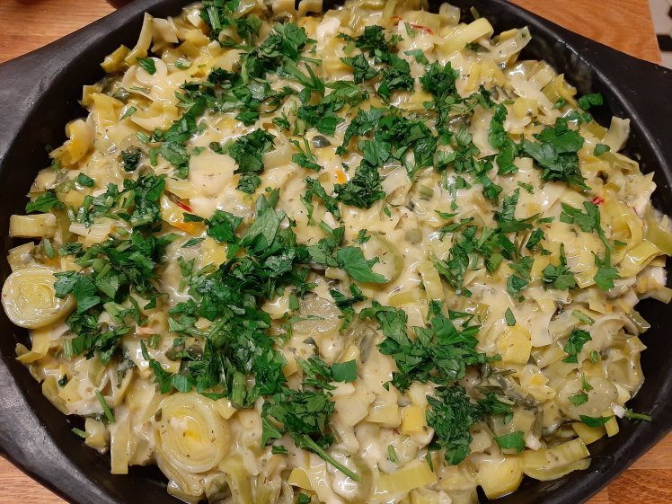 Pour the leek and the sauce on top. Spread chopped fresh parsley.