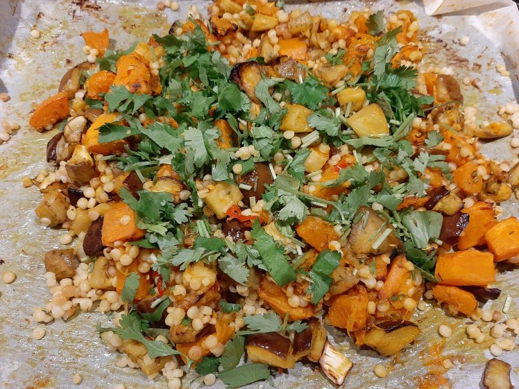 Chop 500 grams of eggplant and 500 grams of tasty pumkin in cubes. Spread on baking paper. Add 1 teaspoon of fennel seeds, 1 teaspoon of cumin seeds, 1/2 teaspoon of coriander seeds, 2 teaspoon of dried thyme and 1/2 teaspoon of turmeric powder. Spread some olive oil. Mix. Bake in the oven at 180° for 30-40 minutes. Stir halfway. Add 4 chopped garlic cloves and 1 chopped chili.