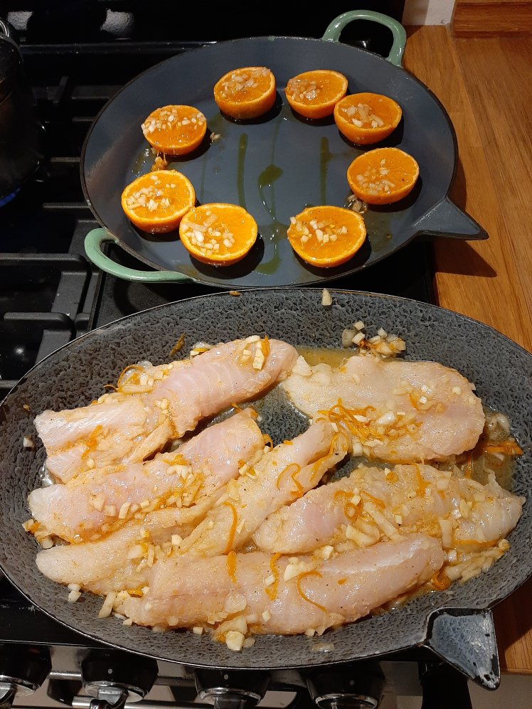Mix 1 chopped shallot, 4 chopped garlic cloves with the zeste and juice of 2 clementines, the juice of 1 lemon and 3 table spoons of olive oil. Add pepper and salt. Spread sea bass filets for 2p ( 300-400 grams) on an oven dish. Brush 1/2 of the marinade on the fish. Add 4 extra clementines ( halved) in the oven.