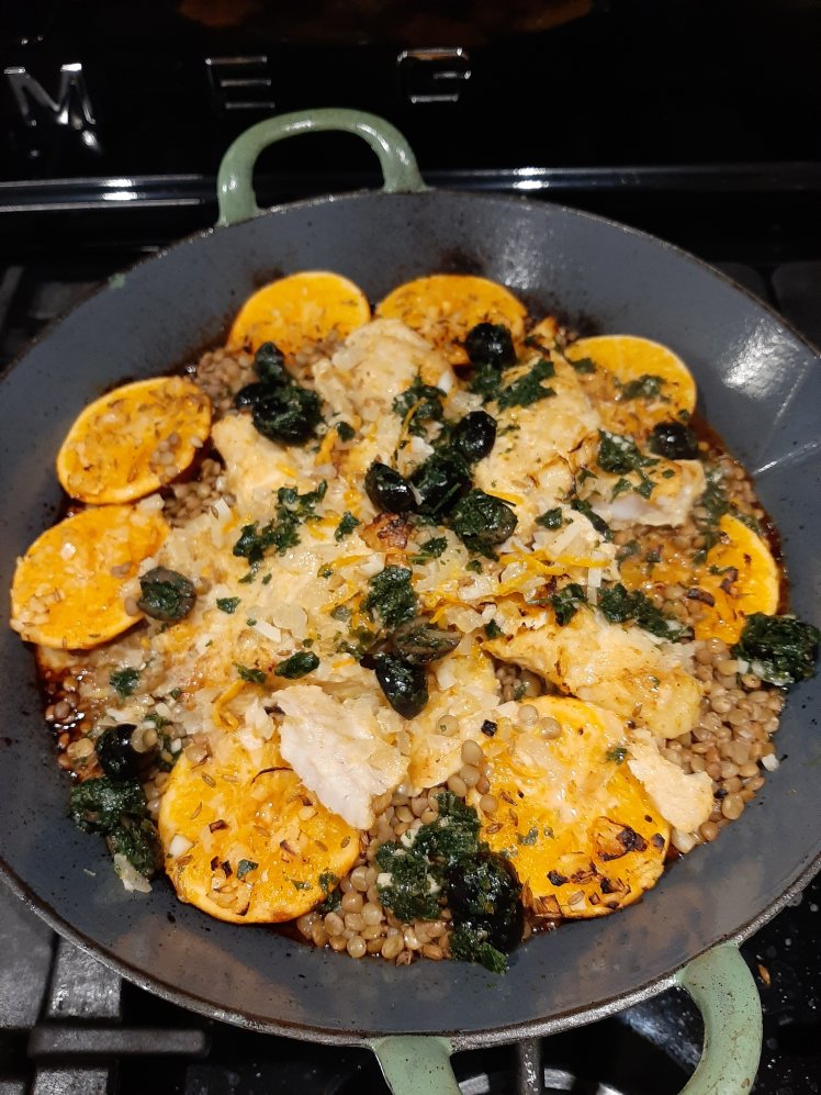 Lentils, fish, clementines and black olives…