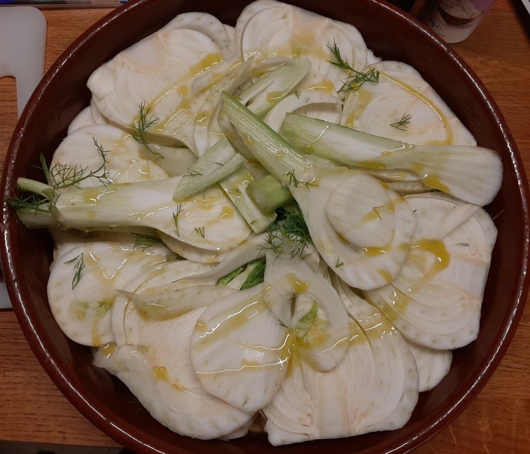 Cut 500 grams of peeled potatoes in slices of 0.5cm. Spread in an oiled oven dish. Slice 2 large fennels. Spread on the potatoes. Spread a little drizzle of olive oil. Bake in the oven at 200° for 40 mins. Cover with aluminium foil if the surface becomes too dark.