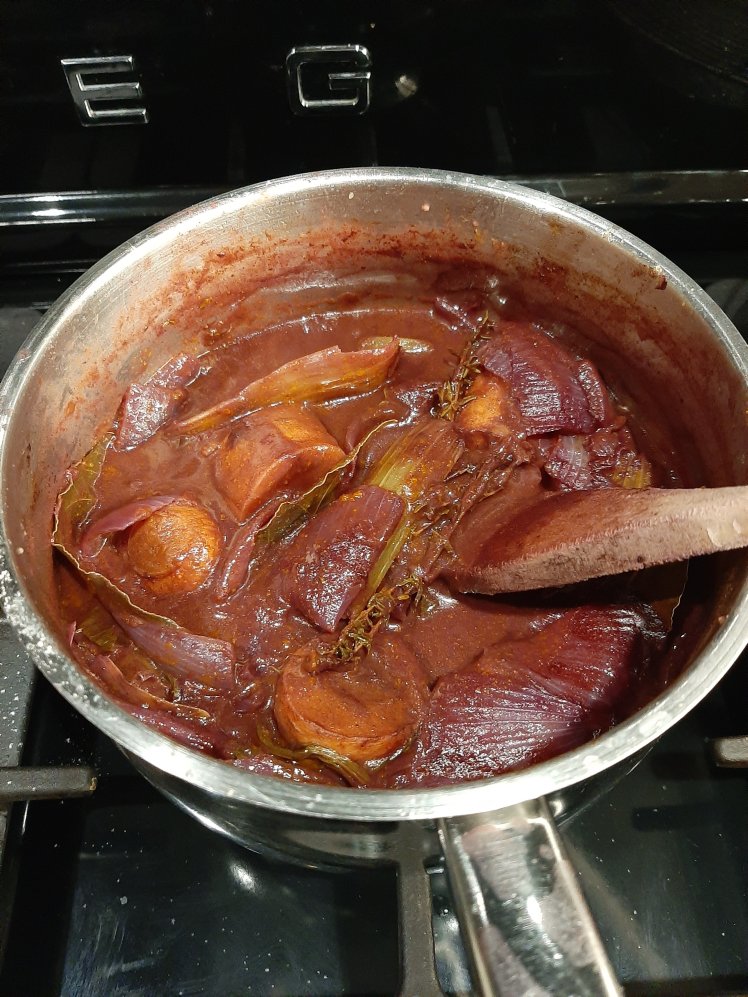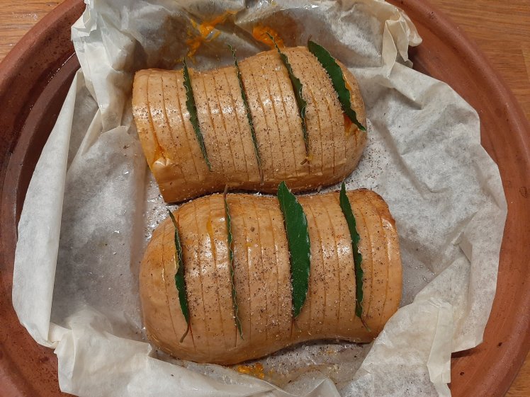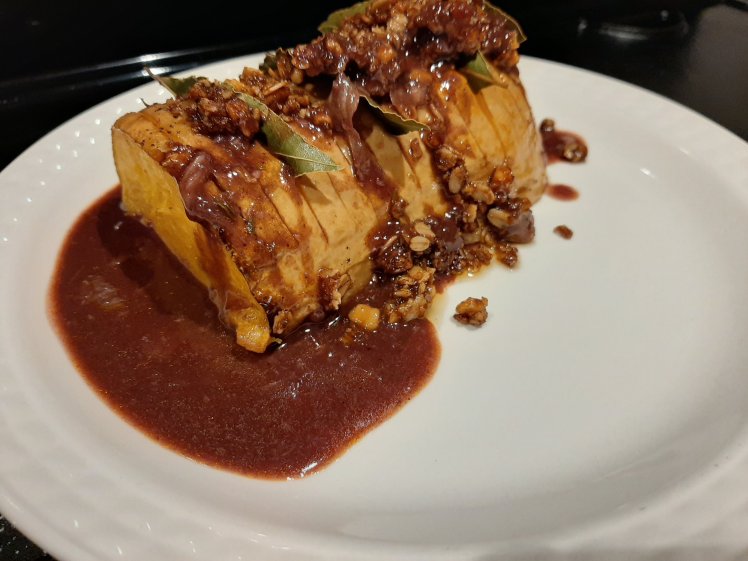 I can’t get enough of the December edition of delicious.nl. Yvette van Boven has written a few awesome side dish recipes for outdoor cooking. The local weather is really awful, so let’s cook inside😉.I prepare the sauce first. Heat a pan with 15 grams of butter. Chop roughly 1 onion, 1 carrot and 1 stem of celery. Add to the pan and bake for a few minutes. Add 1 table spoon of flour and bake. Add 500 ml of red wine, 4 bay leaves, fresh thyme and 1 table spoon of concentrated tomato puree. Allow to simmer until reduced to half of the amount. Set aside.Make a crumble. Mix 50 grams of oat flakes with 30 grams of grinded walnuts, 20 grams of grinded almonds, 30 ml of sunflower oil, 50 grams of honey, pepper, salt and a pinch of nutmeg. Spread on baking paper. Bake in the oven at 160° for 20 minutes. Stir now and again until golden brown. Remove from the oven and cool down. Set aside.Cut 750 grams of a butternut pumkin in equal parts. Remove the seeds. Brush some oil on each side and put on baking paper (skin upwards). Bake at 200° for 20 minutes. Remove the pumpkin from the oven. Create a hasselback effect by making incisions every 5mm. Put a few bay leaves in each half. Spread pepper, salt on the pumpkin. Put the pumpkin with the baking paper in an ovendish with lid. Heat 1,5 table spoons butter in 2 table spoons of white vinegar until the butter has melted. Put the pumpkin in the oven at 200°, covered. Spread the vinegar-butter mixture regularly on the pumpkin.Bake for approximately 40 minutes ( depends on the size of the butternut. Roast a bulb of garlic ( in my new toy😗) at the same time ( covered!).Sieve the sauce. Reheat. Add the squashed garlic. Blend. Taste and finish with soya sauce.Serve the roasted hasselback butternut with the crumble and the sauce.What a flavor bomb 😋. Thanks Yvette van Boven.