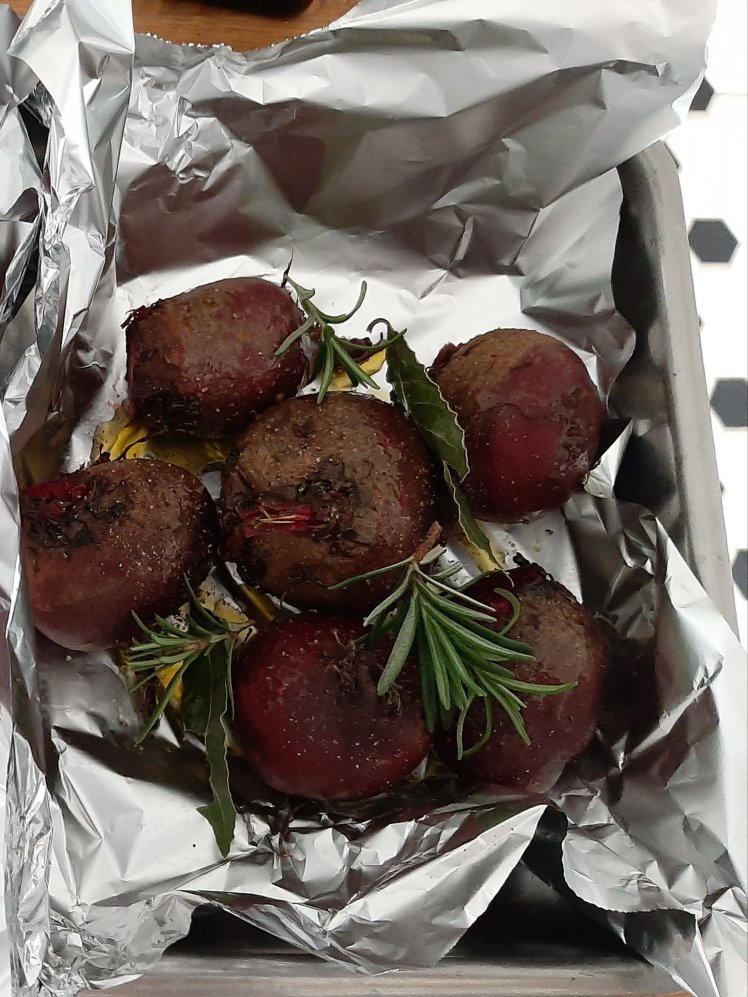 I’m not familiar with the French classical cuisine, and especially not with the elaborated sauces. Inspired again by Yvette van Boven in the December edition of delicious.nl I prepared roasted beetroot in a beurre-blanc variation. Wash 4 little beetroot and remove the ends. Put them on aluminium foil. Spread some olive oil, pepper, salt and a few stems of fresh rosemary and 1 bay leaf. Close the aluminium foil. Bake in the oven at 200 ° for 40-60 minutes ( depends on the size).