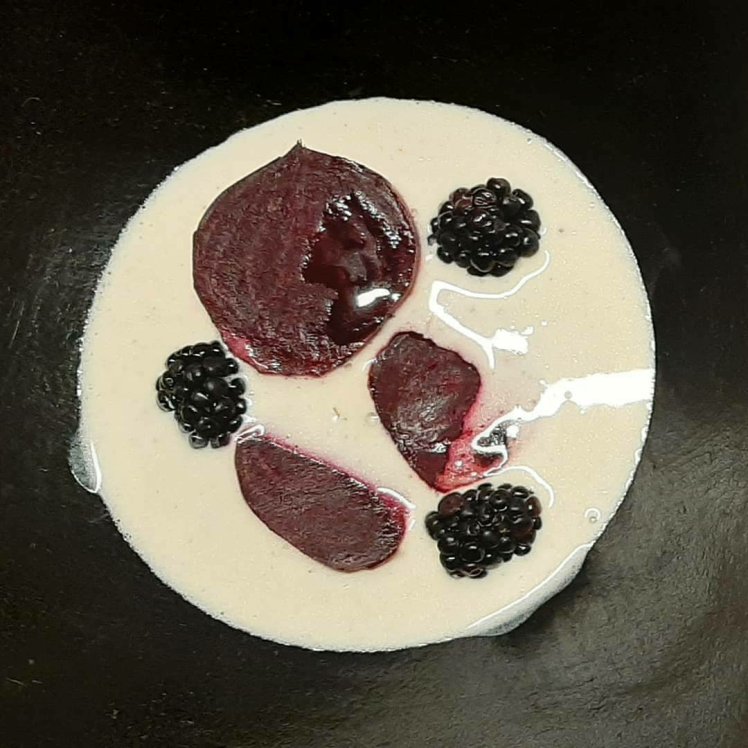 Spread some sauce in a preheated plate. Put the halved beetroots in the sauce. Finish with old syrupy balsamic and a few blackberries.