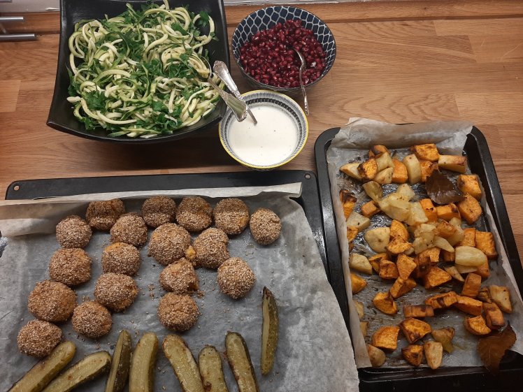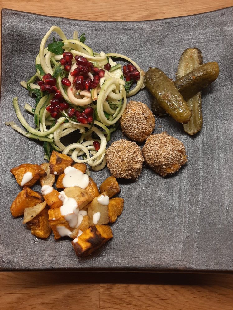 For the falafel, drain 1 can of chickpeas. Put in a small blender. Add 3 chopped carrots, 4 chopped garlic cloves, 1 chopped chili, 4 cm of ginger ( chopped), 1 teaspoon of cumin seeds and 125 grams of ricotta. Blend. Add pepper and salt. Put a few table spoons of sesame seeds in a deep dish. Create small sized balls of the chickpea- mixture. Roll the balls in the sesame seeds. Put them on an oiled baking paper on an oven tray. Store the balls in the fridge until baking time.
