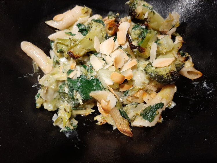 Boil 150 short farro pasta not even ( they will cook further in the oven)al dente. Mix with the vegetables and the sauce. Finish with 25 grams of almond flakes and 20 grams of grated cheddar cheese. Bake in the oven at 180° for 30 minutes, until golden brown.