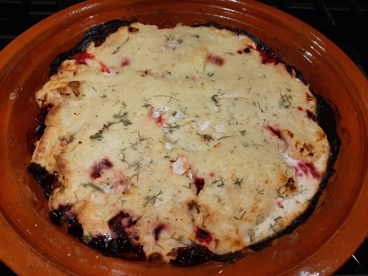 Remove the skin of the beetroot. Chop in small cubes. Spread in an oven dish. Add 4 chopped garlic cloves, 1 sliced red onion and 2 table spoons of olive oil. Cover. Bake in the oven at 200° for 30 minutes. Stir halfway.
