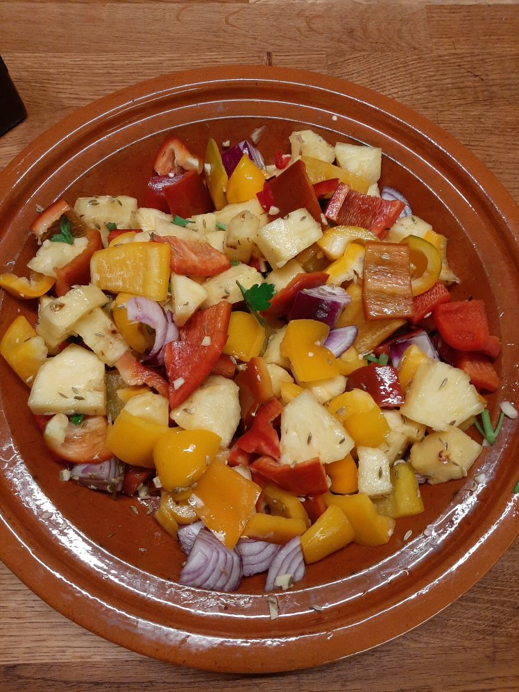 Clean and chop 1 pineapple, 2 bell pepper, 4 garlic cloves, 4 cm of fresh ginger, 1 red onion and the stems of 50 grams of fresh parsley. Put in an oven dish. Mix with 2 table spoons of olive oil , 1 table spoon of fennel seeds and a large pinch of salt.