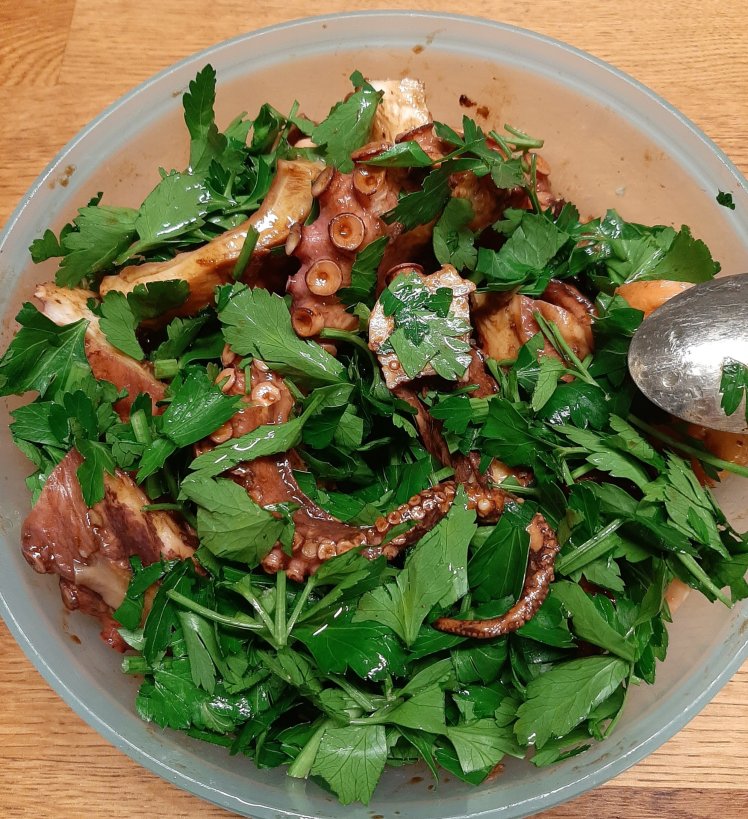 In the meantime, chop the polpo in nice pieces. Mix with the chopped parsley leaves, 1 table spoon of olive oil and 2 table spoons of balsamic vinegar.