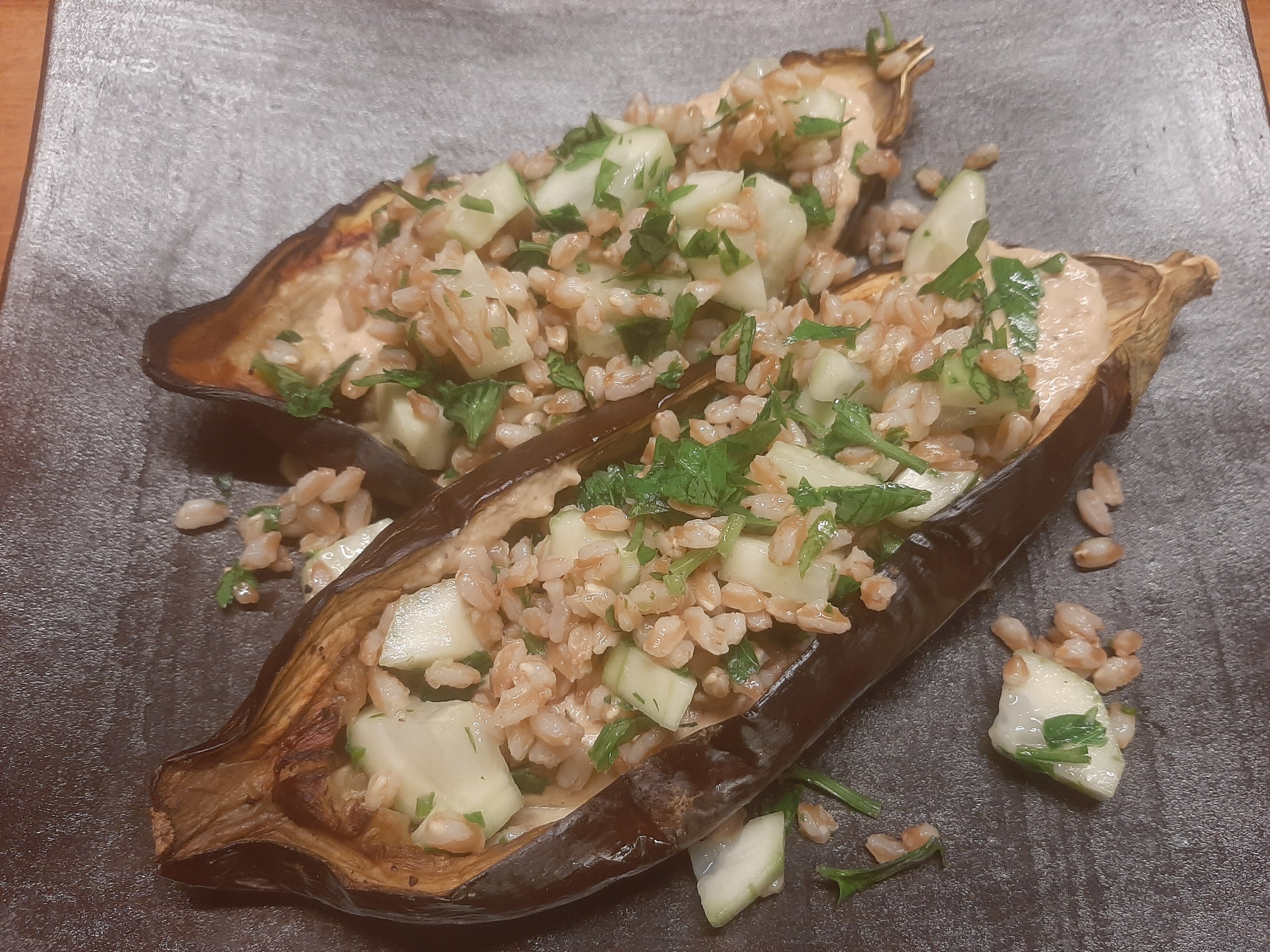 Scoop the flesh from the eggplants but leave the outsides. Blend the flesh, garlic, 1 table spoon of tahini, 170 grams of low fat yogurt and the juice of 1/2 lemon. Season with pepper and salt. Fill the eggplant cups with the mixture.