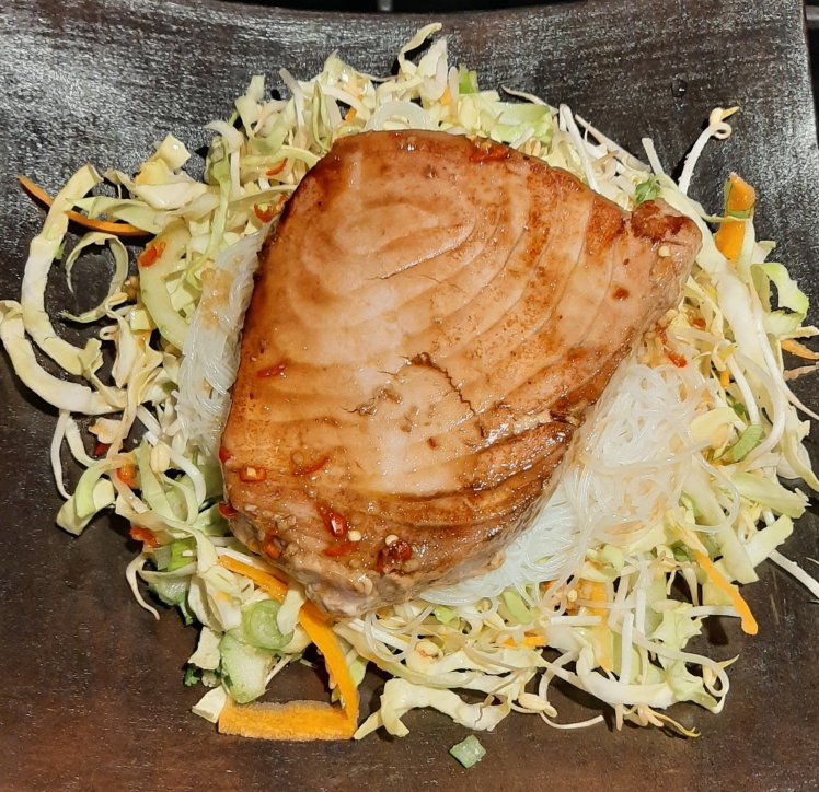 Put 100 grams of rice noodles in boiling water for 3-4 minutes. Drain. Mix the noodles with the salad and most of the dressing. Grill the tuna steaks shortly.
