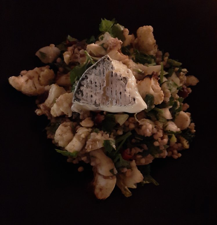 Clean and chop 1 medium sized cauliflower (approximately 700 grams) and don’t forget the stem and leaves. Spread in an oven dish. Mix with 1 table spoon of garam massala and 2 table spoons of olive oil. Bake in the oven at 200° for 20 minutes. Add 4 chopped garlic cloves, 3 chopped spring onions, 1 chopped chili, 50 grams of pistachio, 50 grams of dried cranberries, pepper and salt. Stir and bake for another 20 minutes. Add the buckwheat and stir. Bake for another 15 minutes. Finish with lemon juice and a mixture of fresh parsley and wild fennel. Serve with fresh ricotta or delicious goat cheese.