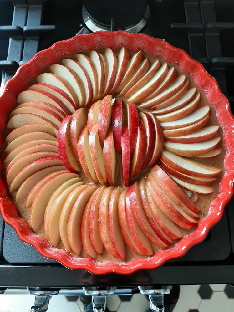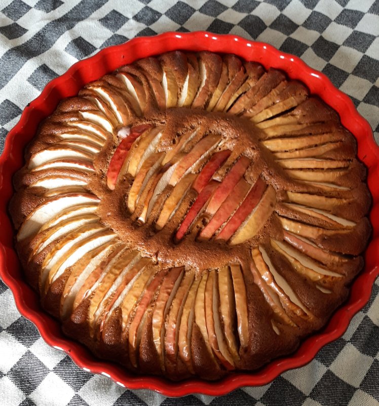 The amount of certain ingredients is not really clear : 6 full table spoons of flour and 6 full table spoons of brown sugar? I decide to use a cup to obtain equal amounts. I start filling the cup with 6 full table spoons of self raising flour. I refill the cup at the same level with the brown sugar. Mix to prevent clotting. Add 2 egg yolks, 6 table spoons of milk, 1/2 teaspoon of cinnamon and a pinch of salt. Mix. Add the battered egg whites. Pour the dough in a buttered flat cake recipient. Spread thinly sliced apple wedges ( for this pie count almost 3 medium sized apples.