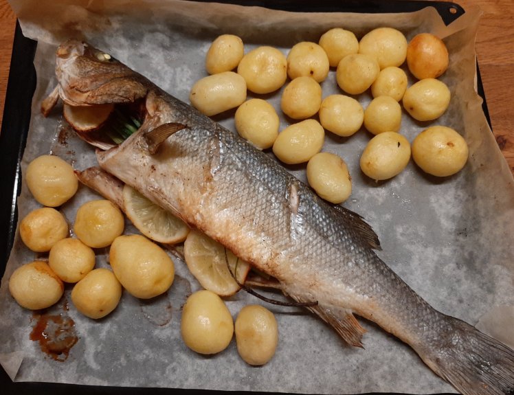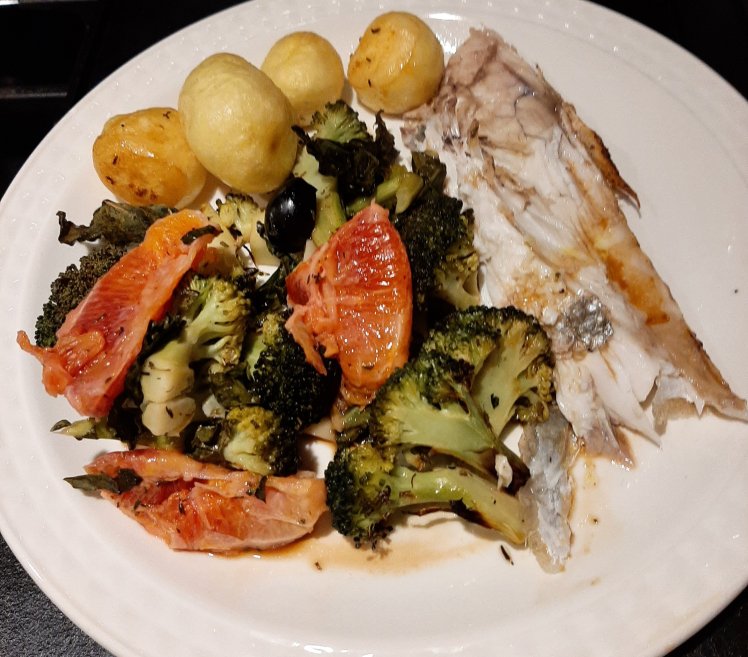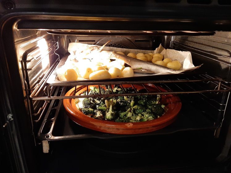 Although we are in the red zone until after the Easter weekend, a visit to the market was ‘allowed’ to buy food and plants. So tonight we can have some fresh sea bass, ovenbaked new potatoes, and roasted broccoli with oranges and black olives😋.Chop 700 grams of broccoli in litte roses and cubes ( add the leaves). Spread in an oven dish. Add 4 chopped garlic cloves, 1 chili and 1 table spoon of dried thyme. Mix 2 table spoons of olive oil with 2 table spoons of lemon juice, 2 table spoons of orange juice, pepper and salt. Spread on the broccoli and stir. Bake in the oven at 200° for 30 minutes and stir halfway. At the same time, roast 600 grams of small new potatoes in the oven.Fill the sea bass with stems of fresh parsley and slices of lemon. Season with pepper and salt. Rub some oil on the outside. Add in the oven during 20 minutes.