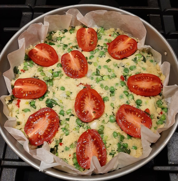 Spread baking paper in a large spring form. Pour the mixture on the paper. Press with your hands. Spread a few halved cherry tomatoes (skin downwards) on the couscous.