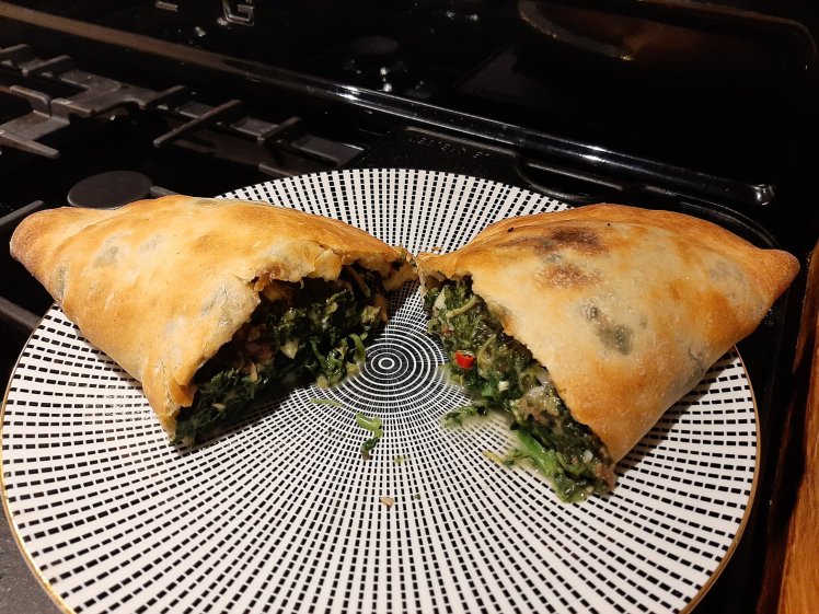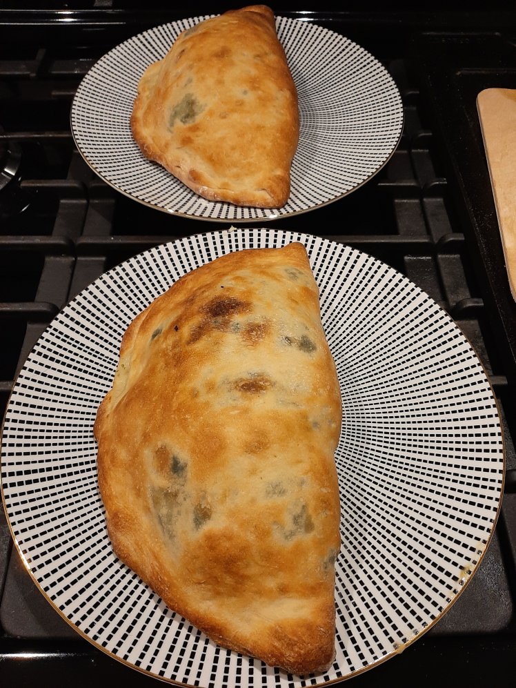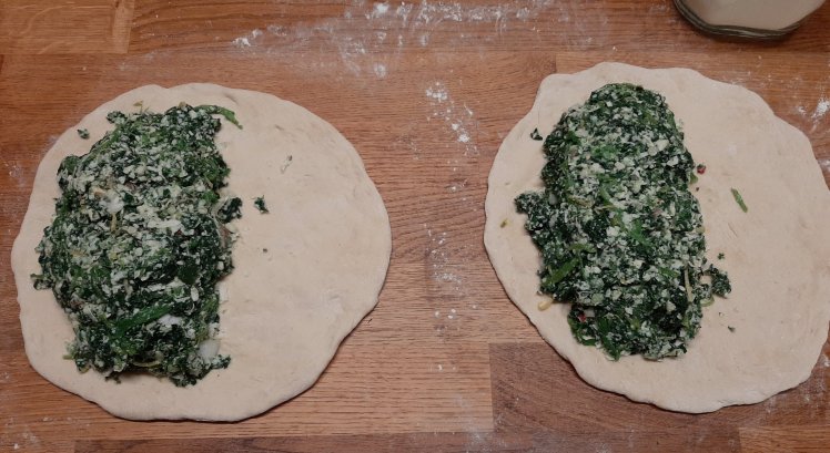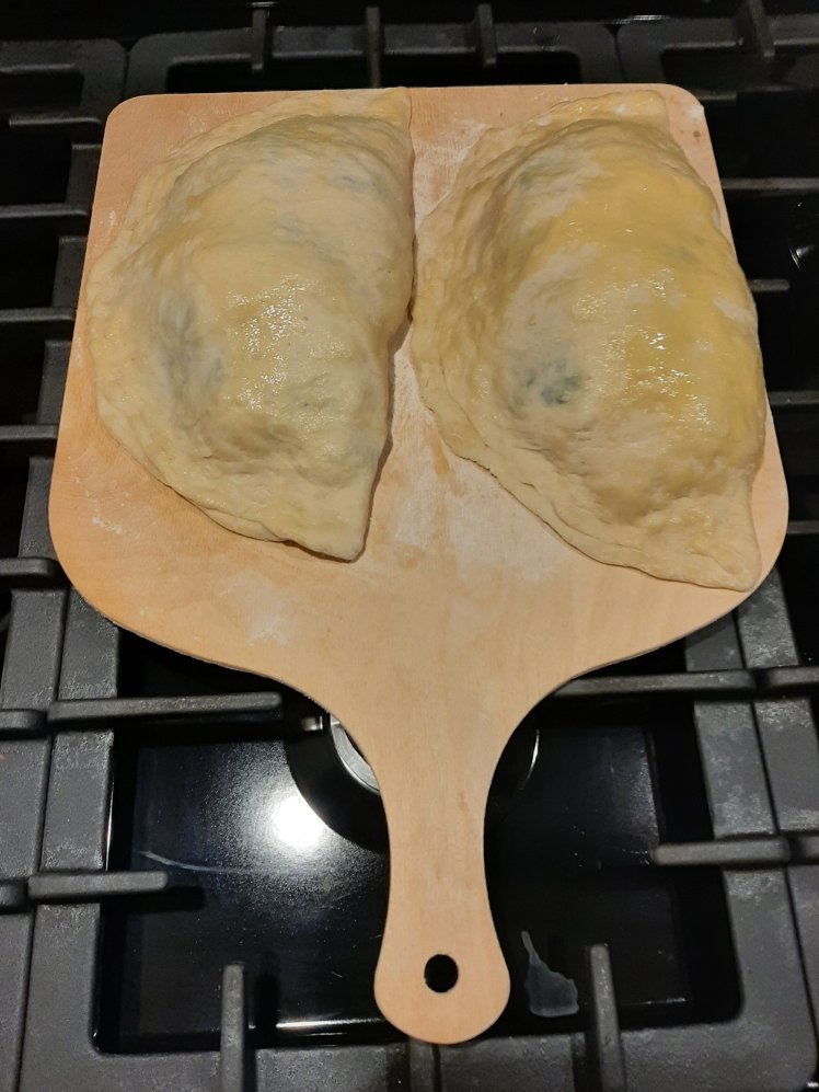 Remove the dough from the fridge. Allow to rest for 30 mins. Spread some flour on the table. Create 2 pizzas. Divide the spinach on each pizza, at one side. Fold and close. Brush some olive oil on the surface.