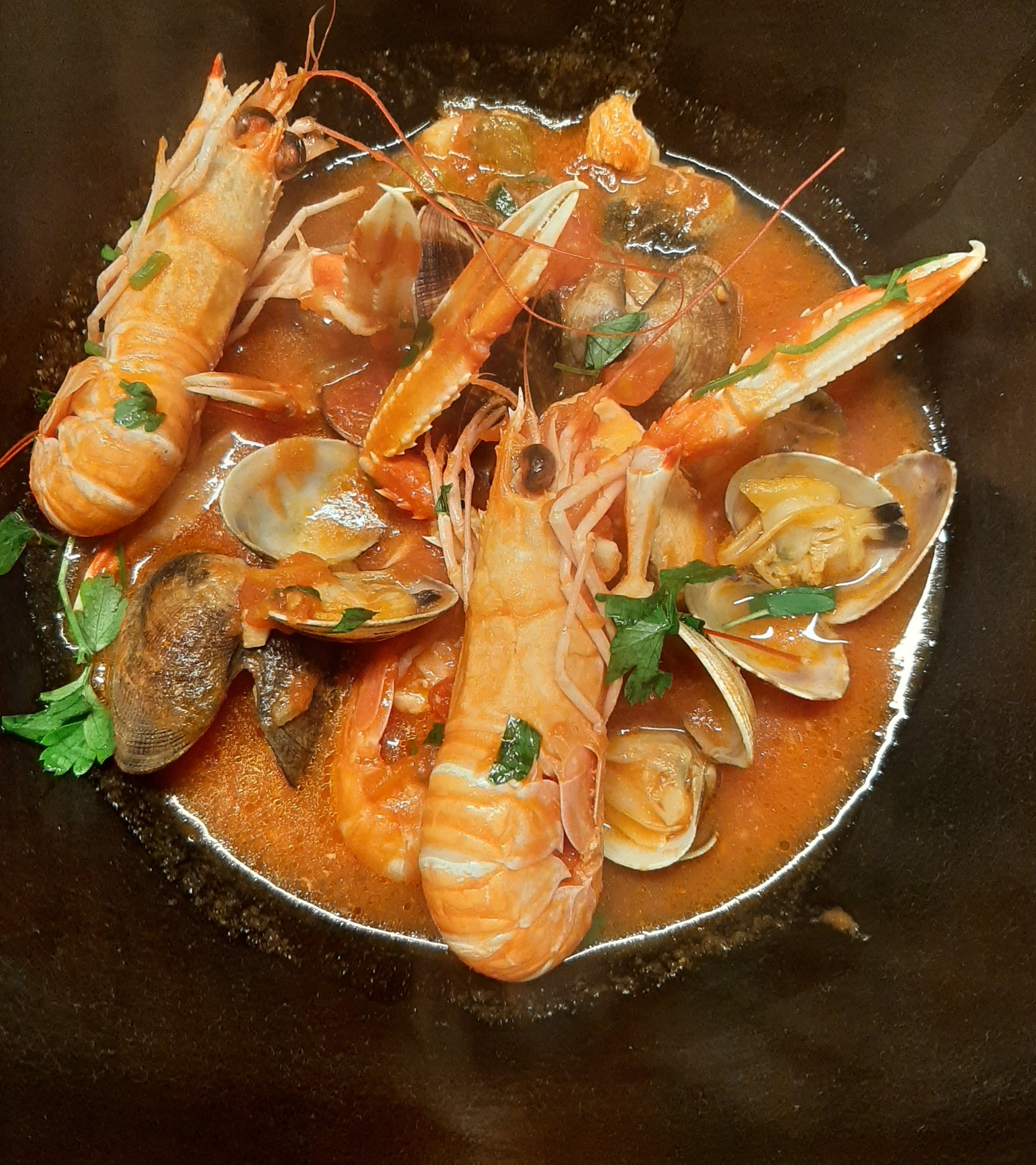 Add the scampi and salmon to the soup. Cook for approximately 5 minutes until al dente. Taste, add pepper and salt. Finish with the vongole, their liquid and a handful of chopped fresh parsley.
