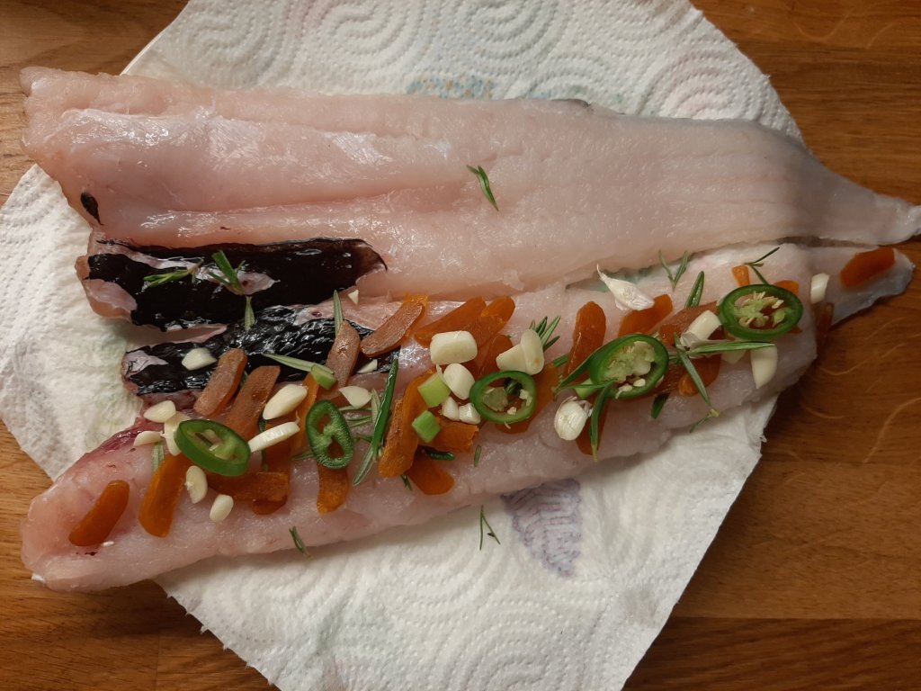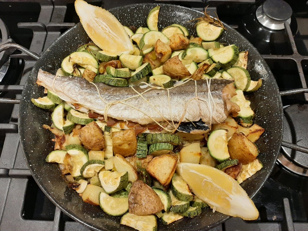 Close with the other piece ( skin outwards). Close with kitchen twine. Add 700 grams of chopped courgettes, the leftover of garlic and chili to the pan. Season with pepper, salt and fresh rosemary. Put the fish on the vegetables and potatoes. Spread 1 table spoon of olive oil. Put back in the oven at 200° for 20-30 minutes. Stir the vegetables halfway.