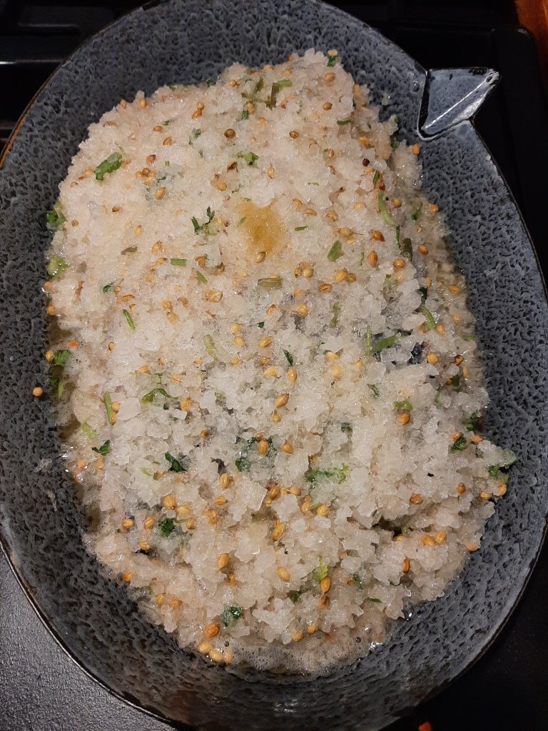 As main course we had a delicious piece of salmon covered with a salted crust, prepared in the oven. Mix 1 kilo of rough sea salt of good quality with 3 egg whites, the chopped stems of a bunch of fresh coriander and 2 table spoons of coriander seeds. Spread a layer on an oven dish ( a bit larger than the fish). Spread 500 grams of salmon filet with skin ( make a few superficial incisions in tbe skin) on the salt. Cover with the salt.