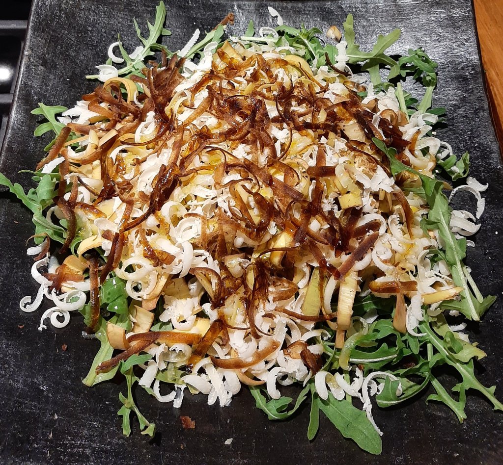 Weekend dinners are always a bit more special. Tonight we’ll start with fresh artichokes. For 2p clean 3 babies by removing the stem, the harder outer leaves and the top. Slice thinly and put in cold water mixed with the juice of 2 lemons. Store cool. Drain and dry. Spread some arugula on the dishes. Divide the artichokes. Finish with grated pecorino or parmesan, balsamic vinegar and olive oil. Instead of the balsamic vinegar I finally tried the balsamic ‘ball’ which I grated, as the cheese.