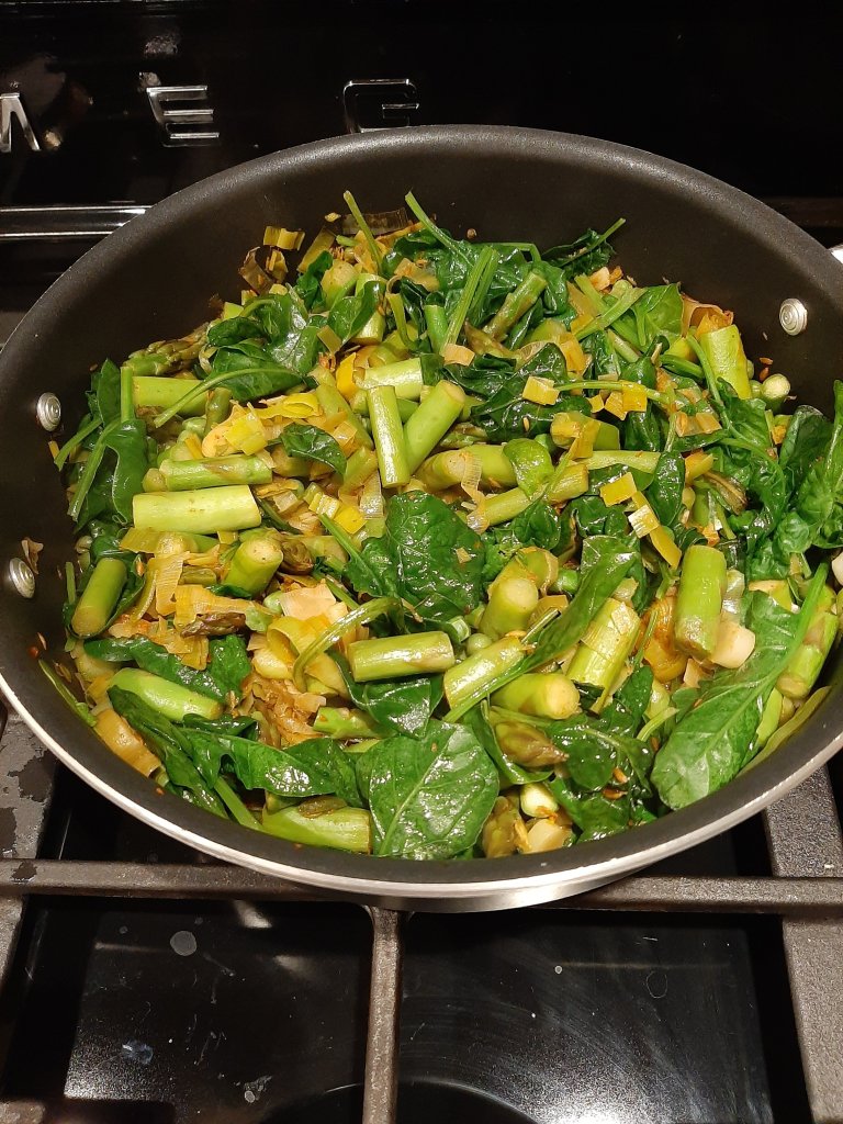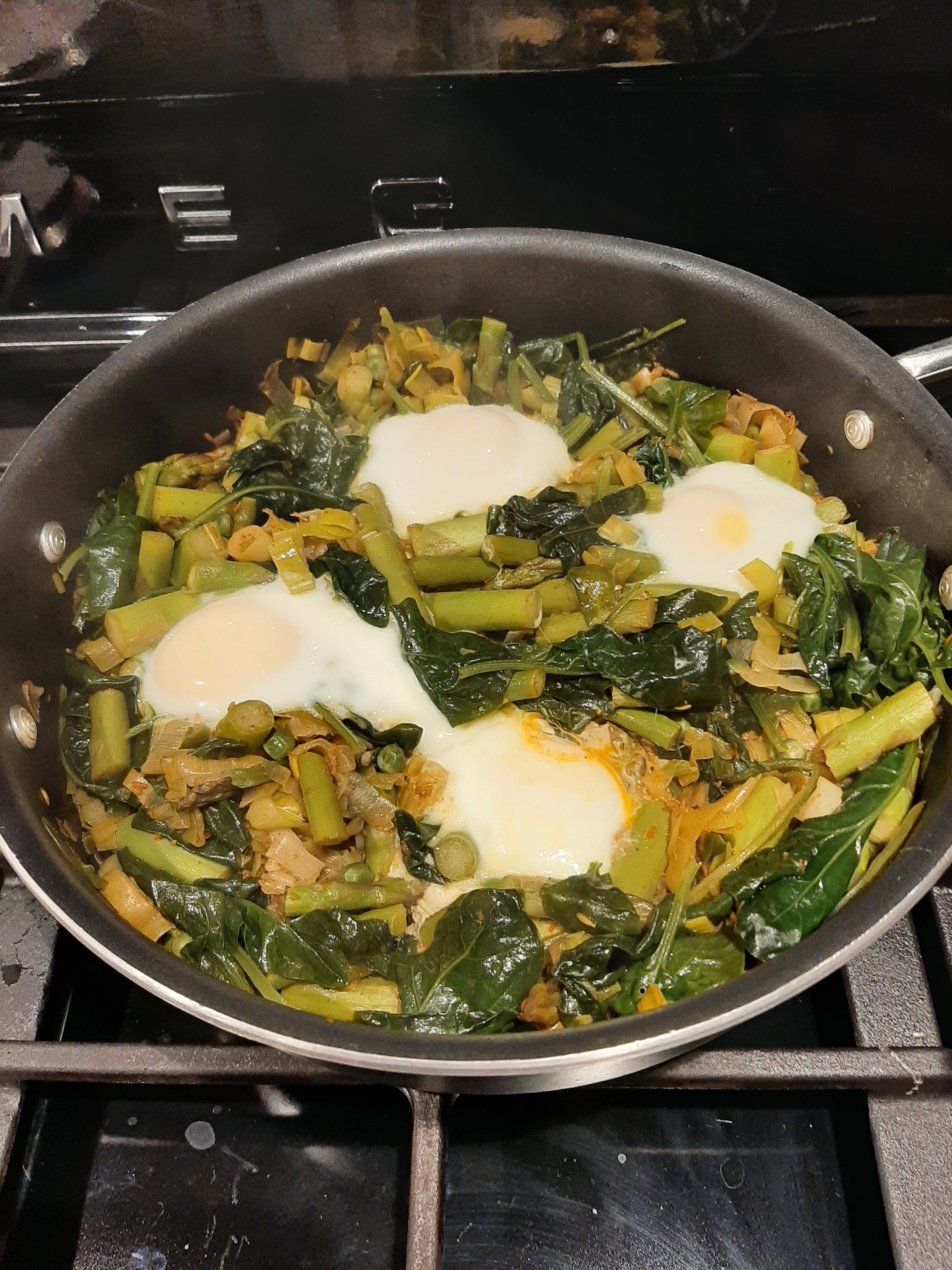 Chop and fry 4 garlic cloves, 1chili and 1 leek in 1,5 table spoons of olive oil. Bake and stir. Add 500 grams of chopped green asparagus and 1 table spoon of cumin seeds. Bake and stir for 10 minutes. Add 250 grams of fresh spinach and a handful of frozen peas . Bake and stir. Add 1 table spoon of rose harissa. Mix. Taste, add pepper and salt. Put 4 raw eggs on the vegetables. Close the pan for 5-10 minutes, until the eggs are ready. Finish with chopped fresh coriander. Easy, healthy and tasty!