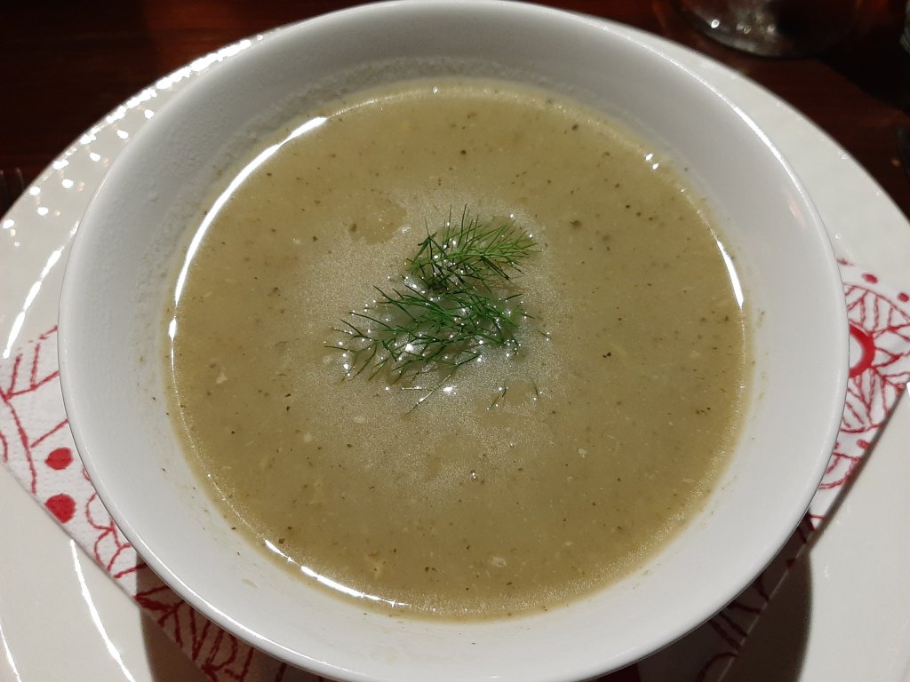 Chop and wash 3 bulbs of fennel. Heat a pan with 2 table spoons of olive oil. Add the fennel, 4 garlic cloves, 1 table spoon of basil and 1 chili. Bake and stir. Add 2 liters of vegetable stock. Allow to simmer for approximately 30 minutes. Blend. Add 300 ml of oatmilk. Taste, add pepper and salt. Finish with wild fennel.
