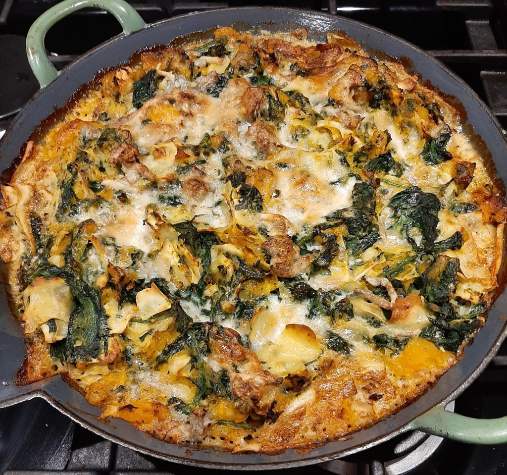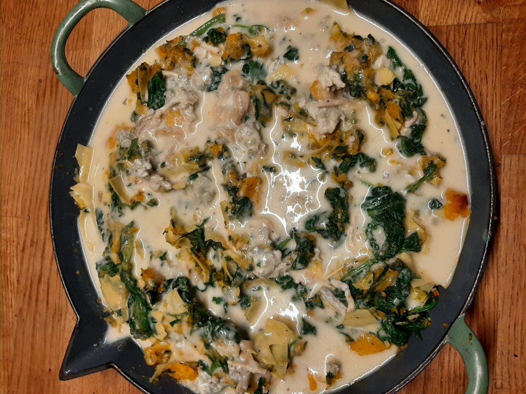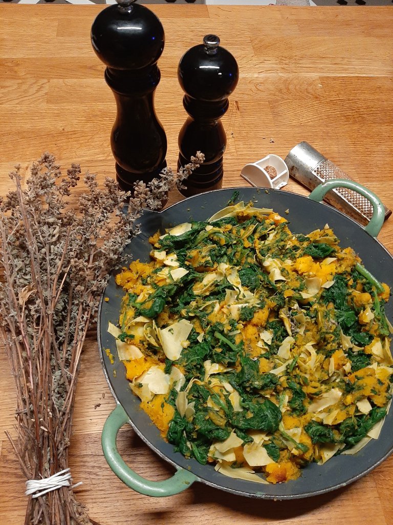 Mix pumpkin, spinach and 100 grams of fresh lasagna sheets ( or frozen ones) cut in pieces ( maltagliati).