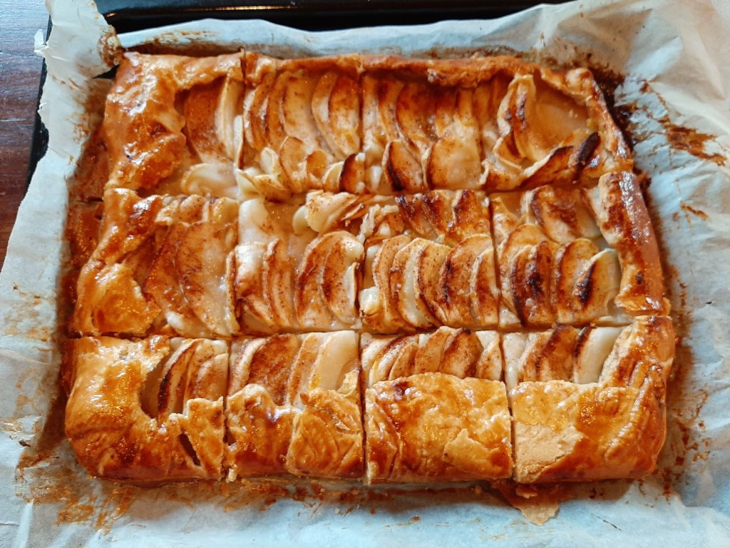 A common form of galette resembles a type of single crust, free-form pie with a fruit filling and the crust folded partway over the top of the filling, as you can read on Wikipedia. It’s an easy homemade version which can be compared with puff pastry. Today I seem to be in a French mood. We have some onion soup for lunch and a galette with apples in the afternoon. Can it be more Sunday?