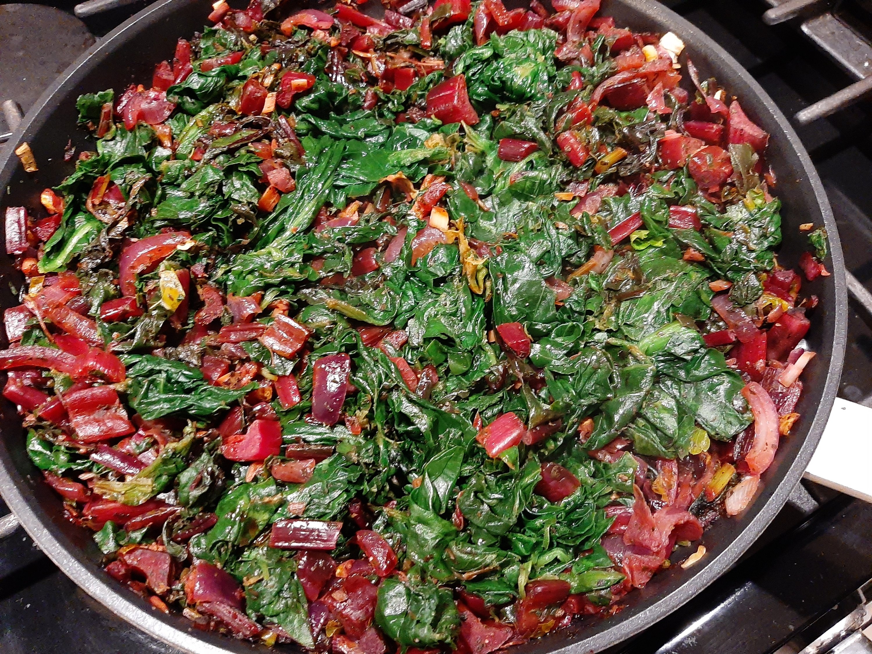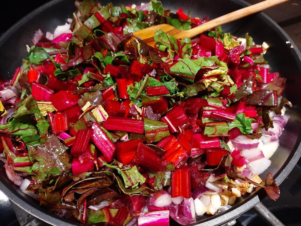 The leaves of a bunch of beetroot ( almost 400 grams) are still in a perfect condition thanks to my amazing Tupperware recipients. After a good wash and inspection chop the good parts. Chop 1 red onion, 4 garlic cloves. Heat a pan with 2 table spoons of olive oil. Pour all the chopped vegetables in the pan and bake. Stir regularly. To increase the amount of greens, add 450 grams of defrosted spinach leaves. Season with pepper, salt, 1 table spoon of dried basil and a drizzle of balsamic vinegar. Set aside.