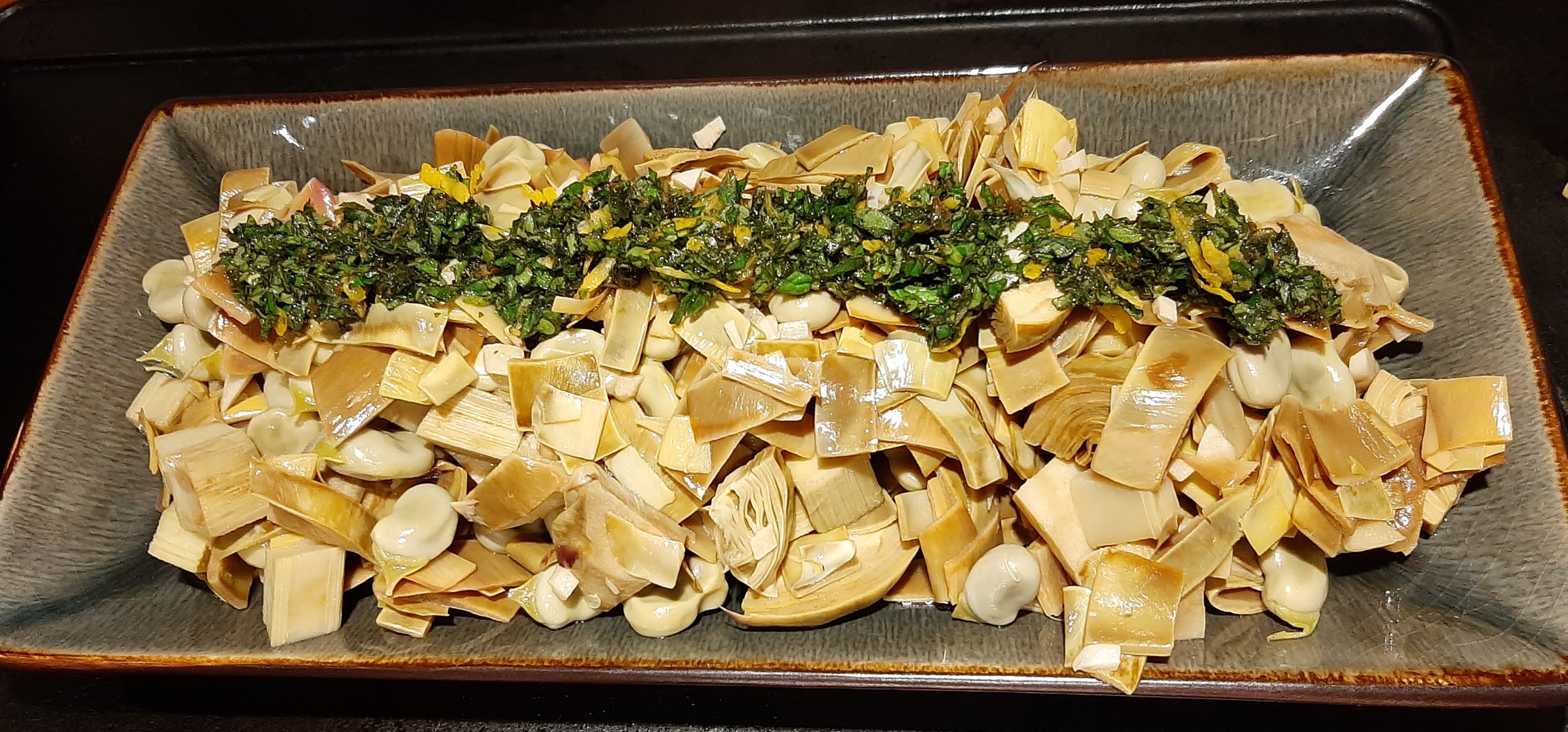 Springtime vegetables such as fresh green beans ( fave) and artichokes are a perfect couple to bring us back in the right mood. Fritedda is a typical Sicilian vegetable stew with artichokes, fresh peas and beans. Today we will have to do it without the peas. For 2p, as side dish or starter, clean and slice 2 artichokes, and pod 1 kilo of fresh beans. Chop 2 garlic cloves, and 1 shallot. Fry in 1 table spoon of olive oil. Add the vegetables. Stir and fry for a few minutes. Add 2 table spoons of white wine vinegar, a pinch of salt, a few branches of fresh oregano and 100 ml of hot water. Cover the pan. Allow to simmer for 15 min. Cool down.