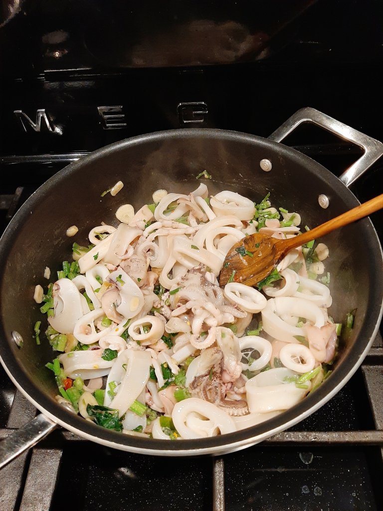Buy fresh calamari. Ask Mirco or your fishmonger to clean them for you. A portion of 300-350 grams is a perfect for 2p. Store in the freezer if you can’t prepare them on the same day. Defrost, rinse and chop.