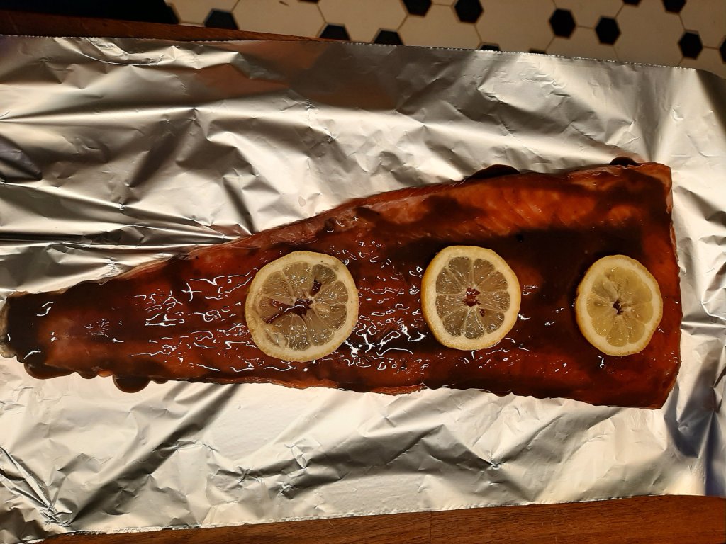 Home made smoked salmon was on my to-do list for a while. So I asked Mirco to prepare me 1 kilo of salmon filet with skin. Although the recipe wasn’t exactly what I wanted, it was a very tasty way of preparing a salmon. Mix 100 grams of sea salt with 50 grams of brown sugar. Spread the mixture on both sides of the salmon and store in the fridge for  2 h. Clean the fish thoroughly, rinse with water and dry. Mix 1 table spoon of a good tasting mustard ( I used a mustard with green pepper) and 1/2 table spoon of brown sugar. Put the salmon on aluminium foil with the skin downwards. Brush the mixture on the salmon. Spread a few slices of lemon. Preheat the oven or barbecue ( one which can be closed) at 110°. Bake the fish for 30 minutes ( the temperature in the fish will be then approximately 50-60 °). Cool down. Put 1/2 portion in the freezer for another occasion. Ps so sorry I forgot the box with wood to give the salmon a smoked flavor😏.