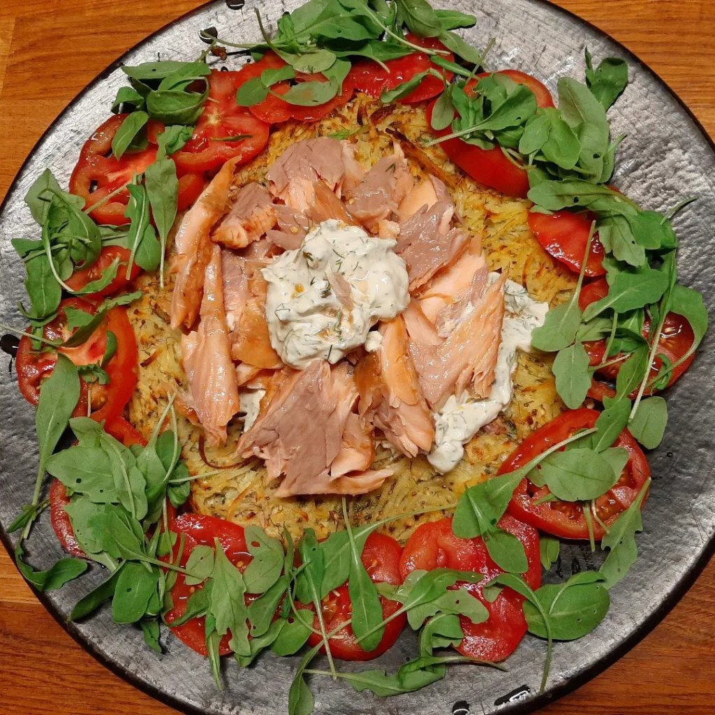 Serve the potato cake with the homemade or ready made smoked salmon, the yogurt sauce, a few tomatoes, arugula salad and lemon.