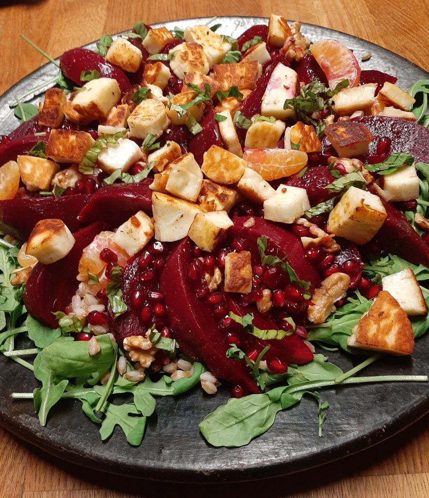 Take a large plate. Spread 100 grams of arugula salad. Spread the beetroot, clementines, 30 grams of walnuts, some seeds of the pomegranate and the halloumi. Finish with the dressing and some fresh basil.